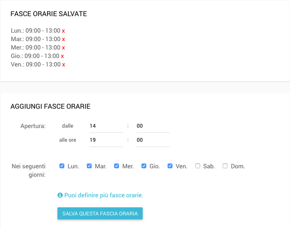 - Orari di apertura e giorni di chiusura in agenda