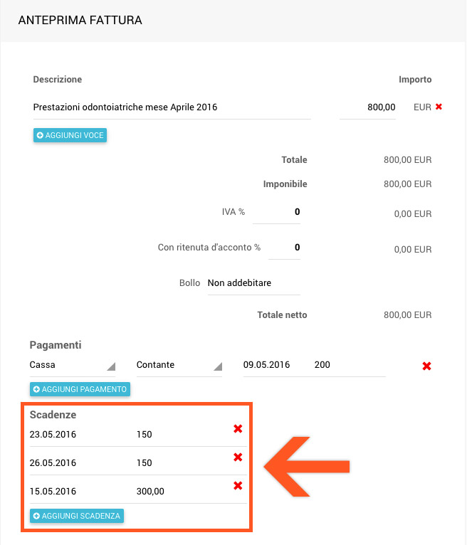 Così come già avviene con i Piani di trattamento, anche per le fatture in entrata è ora possibile gestire le scadenze. Al momento della creazione della fattura, sulla destra, sotto la voce “Pagamenti”, è possibile impostare la data di scadenza. In Contabilità => Fatture in entrata, sono visualizzate tutte le fatture in entrata, con le scadenze in risalto.