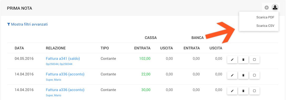 - Andare su Contabilità => Prima nota e cliccare sul pulsante di Export in alto a destra. Scaricare il file CSV della Prima nota, per inviarla al commercialista.