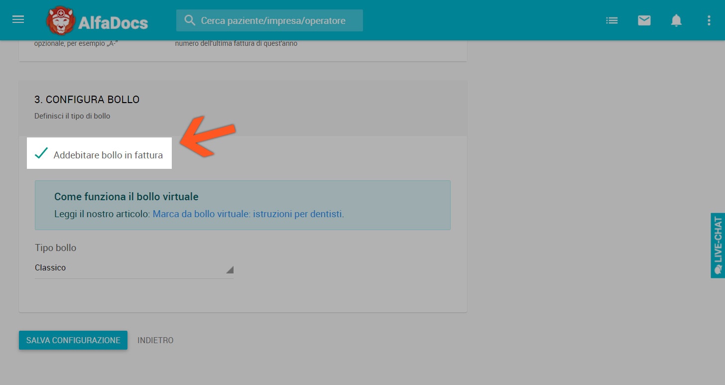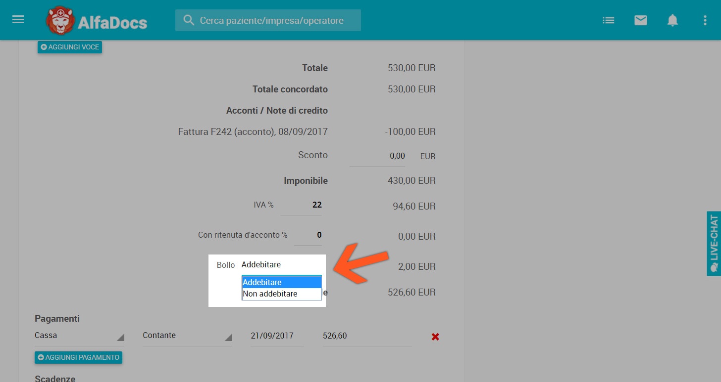 Sul modulo per aggiungere la fattura, adesso puoi scegliere se addebitare al paziente il costo del bollo, scalando 2 € dal totale, oppure non inserirlo in fattura. Scegliendo la voce “Non addebitare”, la fattura presenterà la dicitura con l’esclusione dall'imposta di bollo a norma di legge, anche se il valore della fattura supera EURO 77.47.
