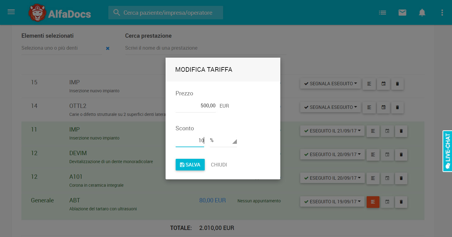Cliccando sulla tariffe della prestazione sul Piano di cura, adesso si può applicare uno sconto in percentuale o in euro sulle singole prestazioni del Piano di cura, mentre prima era soltanto possibile inserire uno sconto sul totale del Piano di cura.