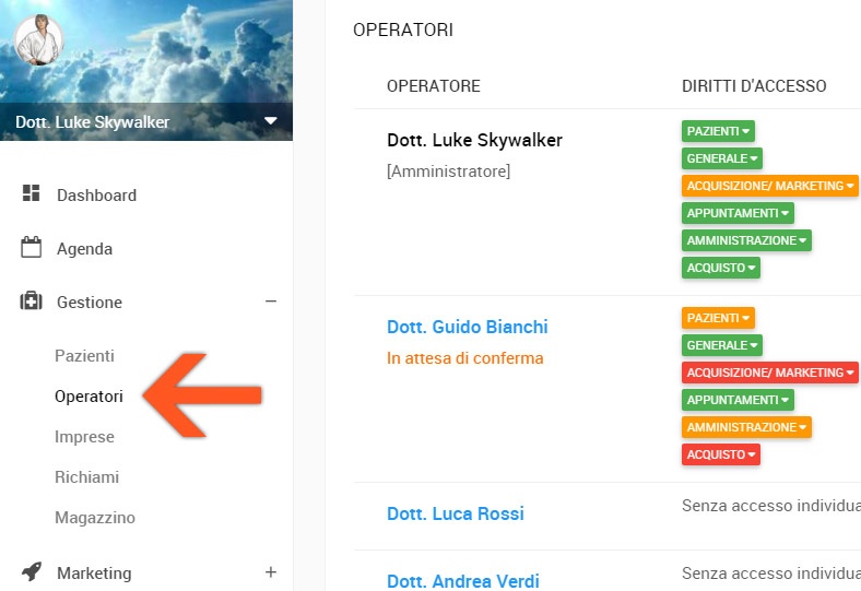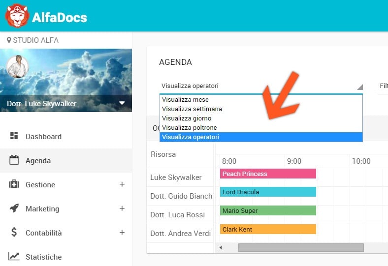 Oltre alla visualizzazione dell’agenda per Mese, Settimana, Giorno, Poltrone, da oggi è disponibile la visualizzazione per Operatori. Clicca sul menù a tendina in alto a sinistra, seleziona la voce Visualizza Operatori, per visualizzare, in un’unica schermata, l’agenda di tutti gli operatori dello studio: