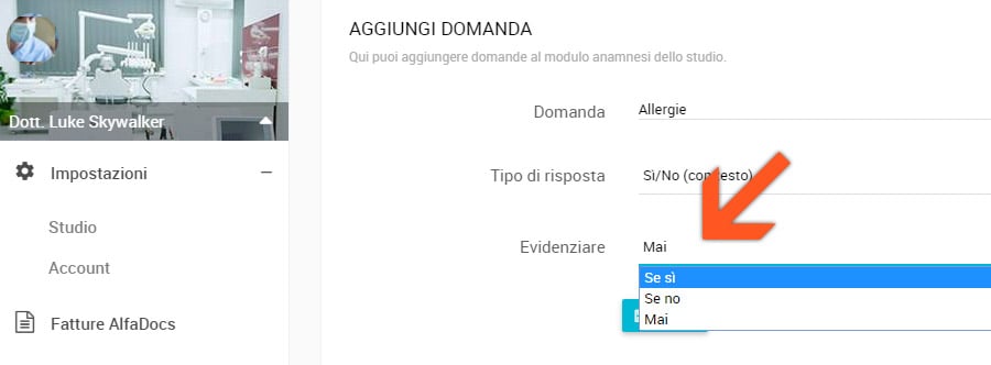 La scheda di anamnesi si avvale da oggi della funzione Evidenziare. Nel Modulo Anamnesi (Impostazioni => Studio => Anamnesi) puoi scegliere, per ogni domanda, quando evidenziare la risposta. Puoi evidenziare quando la risposta è sì, quando la risposta è no, oppure mai. Ad esempio, se decidi di evidenziare la domanda Allergie quando la risposta è sì, nella scheda del paziente che ha risposto sì, troverai la sua risposta evidenziata.