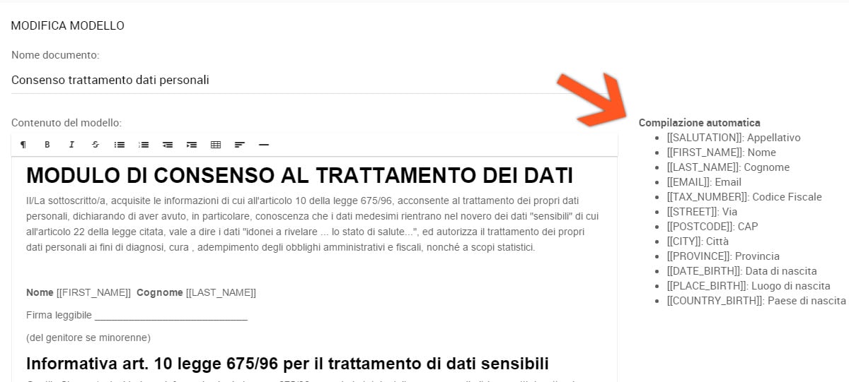 Quando crei un nuovo documento modello (cliccando sulla foto profilo in alto a sinistra, e poi Impostazioni => Studio => Documenti Modelli), o quando modifichi un documento modello già esistente, puoi adesso aggiungere dei campi per la compilazione automatica. In questo modo, quando andrai a preparare un documento per un paziente, le informazioni del paziente verranno caricate in automatico.