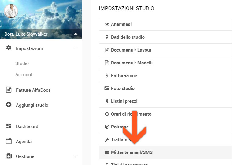 Ora puoi impostare manualmente il mittente delle email e degli SMS che invii ai tuoi pazienti. Per impostare il mittente, clicca sulla foto profilo in alto a sinistra, poi Impostazioni => Studio => Mittente email/SMS. In questa pagina puoi scrivere il mittente che i tuoi pazienti visualizzeranno quando riceveranno le tue comunicazioni, come, ad esempio, i promemoria automatici degli appuntamenti.